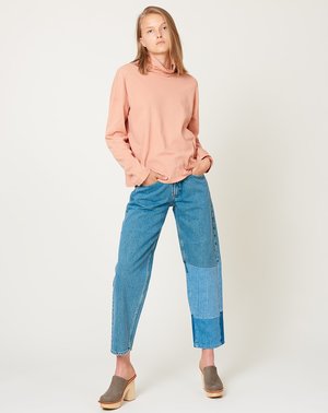 Olderbrother light wash Denim Tile Patch Jeans. Mid-rise, straight fit jeans with zip and button closure. Made in Organic Japanese selvedge denim. Non stretch. Fit: Unisex sizing Material: Cotton Origin: Dyed and sewn in California Care: Gentle wash cold with pH neutral soap and like colors Model: Sarah (5'9", 23" waist, 34" hip, 32A) wears size Small Why we Covet: Eco-conscious universal garments Shown here with: Olderbrother Turtleneck in Chantrelle, Rachel Comey Bradley Clog in Grey