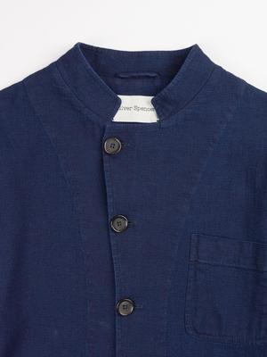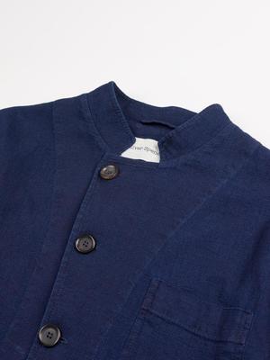 The Artist Jacket by Oliver Spencer in Kildale Indigo is a highly versatile piece that features ample pockets, a tailored silhouette, and a textured, indigo-dyed woven cotton fabric. - 100% cotton - Indigo dyed fabric will gain in character with wash + wear - Patch pockets at hips and chest w/ interior pocket - Can be worn as a stand collar, or classic lapel - 5-button closure makes this piece ideal for layering year round - Straight cut hem - Single button closure at cuff - Made in Portugal