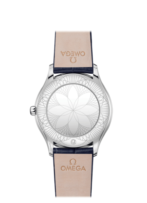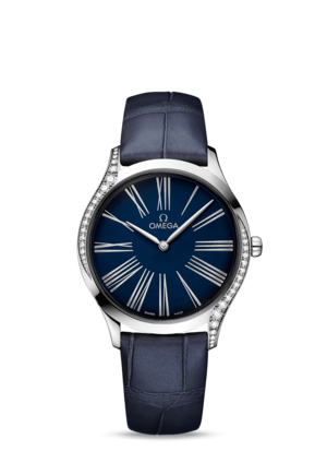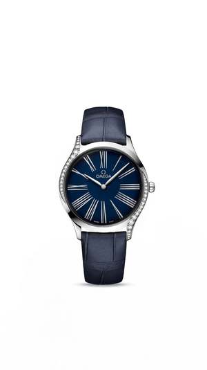 Omega De Ville Trsor Quartz 36mm Steel on Leather OMEGA has a long tradition of creating beautiful watches for women. In this contemporary collectsion, each watch has been crafted with a pure design and a truly modern edge. The slim 36 mm case is made from stainless steel and features diamond paving that curves along each side, as well as a crown that is polished with red "Hy Ceram" and set with a single diamond. The lacquered blue dial includes unique transferred Roman numerals and rhodium-plated hands. The watch is driven by the OMEGA calibre 4061, which sits behind a special mirrored caseback with a "Her Time" pattern. Finally, the watch is presented on a blue leather strap. MOVEMENT Calibre: Omega 4061 Quartz movement with "Long Life" feature to maximize the autonomy of the battery. Exclusive red Omega logo2 with rhodium-plated parts and circular graining. Battery Life: 48 months Crystal: Domed, scratch-resistant sapphire crystal with anti-reflective treatment inside Water Resistance: 3 bar (30 metres / 100 feet) WATCH CASE & DIAL Case: Steel Case Diameter: 36 mm Between Lugs: 18mm Thickness: 8.9mm Dial Colour: Blue Total product weight (Approx.): 43g STRAP Strap Type: Leather strap Strap Color: Blue Strap Surface: Non-grained Calf Leather Strap Underside: Calf Leather Buckle Type: Pin Buckle Buckle Material: Stainless Steel FEATURES Diamonds Swiss made.