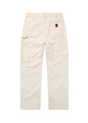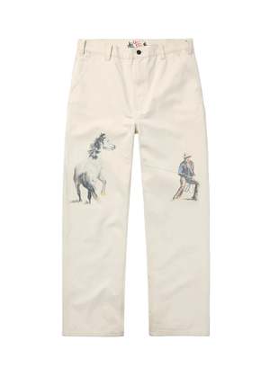 The Rest of Time Painter Pants in Natural White from One Of These Days. A straight-leg painter pant in a natural wash with printed artwork and utility detailing throughout. Built with triple-needle stitching and reinforced belt loops, plus heavyweight twill pocket bags for added durability. Features: - Printed artwork - Triple-needle stitching throughout for durability - Hammer loop and tool pockets - Straight leg fit - Slanted side pockets for easy access - Zip fly - Reinforced belt loops - Heavyweight twill pocket bags - Leather horse back pocket patch Specs: - Style: If Not For The Rest Of Time Painters Pant Natural - Fit: Straight leg - Artwork: Printed - Closure: Zip fly - Construction: Triple-needle stitching throughout; reinforced belt loops - Utility: Hammer loop; tool pockets - Pockets: Slanted side pockets; heavyweight twill pocket bags - Details: Leather horse back pocket patch - Type: Pants