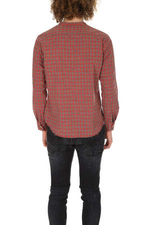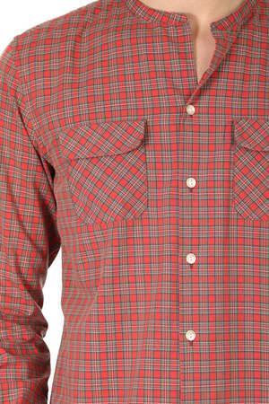 Tartan plaid shirt with slightly elongated body. Raw hem dual flap pockets at chest, and rounded mandarin collar. - Color: Red - 100% Cotton - Made In Japan - Machine Wash Cold Model is 6'1" wearing size M Designer ONES STROKE