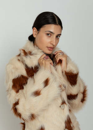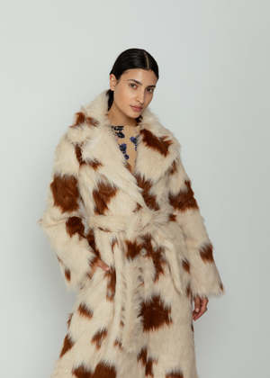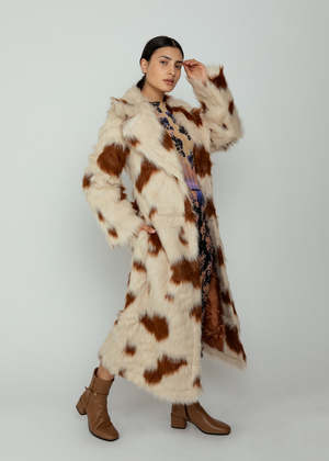 OOFWear's Eco Fur Long Coat features a quilted nylon lining, relaxed fit and button front. Details - Relaxed fit. Button front. - Long sleeved. Quilted nylon lining. - Soft, faux fur. Adjustable tie belt. - Hip pockets. - Dry clean. - Made in China. Color natural/brown. 60% acetate, 40% polyester.
