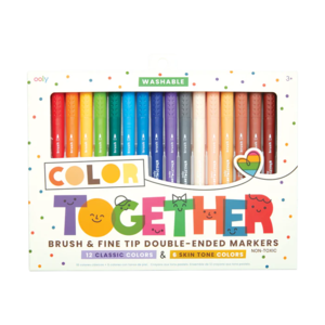 Express yourself with every color in the rainbow. An essential for any artist, this pack of 18 double-ended markers from OOLYs Color Together collectsion features 12 classic colors and 6 skin tone colors. Each washable marker is designed with a brush tip on one end and a marker tip on the other. - Color Together marker set with 12 rainbow colors and 6 skin tone colors - These markers are washable and nontoxic - Each marker has a brush tip and a marker tip - Suitable for ages 3 and up