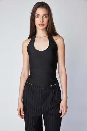 The perfect halter Slinky satin knit fabric that contours the body Made in Los Angeles Model is 59 and wearing size small