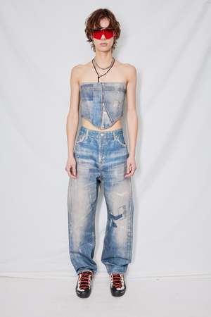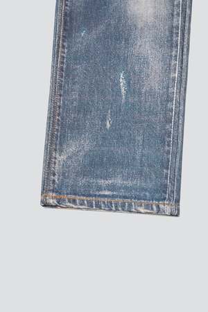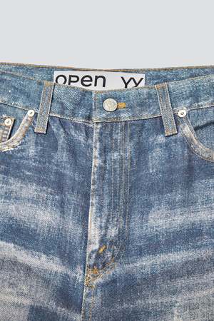 Denim Blue Jean Effect Pants from Open YY. Non-stretch denim jeans. Trompe l'il fading and distressing throughout. Belt loops. Four-pocket styling. Zip-fly. Logo patch at back waistband. Contrast stitching in tan. - 100% Cotton - Made in South Korea