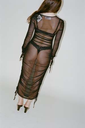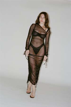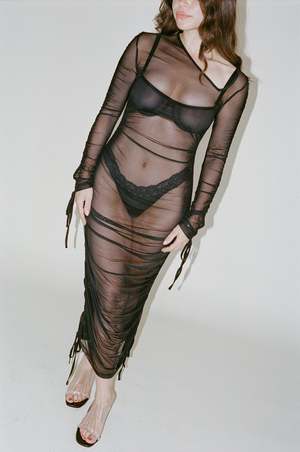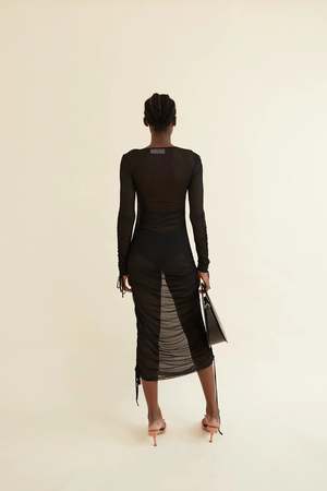 Opera Sport's Brigitte Dress is crafted from sheer 100% black recycled polyester. The dress is designed with a fitted silhouette, long sleeves, and a below-knee length. It features an asymmetrical neckline that has been part of OpraSPORT's editions since the beginning. - Sheer - Mid Length - Asymmetrical V-neckline - Ruched detailing with adjustable tie on both sides Composition: 100% recycled polyester.