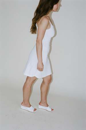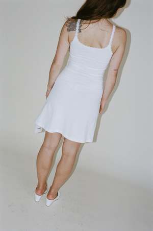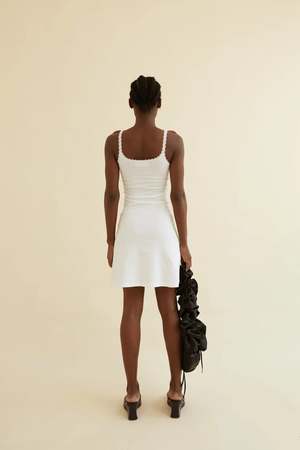 The Mirabelle Dress in White is made from 100% organic cotton, featuring a slim-fit silhouette and a flattering mid-thigh length. A delicate lace trim around the neckline adds a feminine and delicate touch, while the Opera logo2 branding in white on the chest complements its minimalist design. Simple yet elegant, this dress is ideal for casual or semi-formal occasions and can easily be layered for a fun, stylish twist.