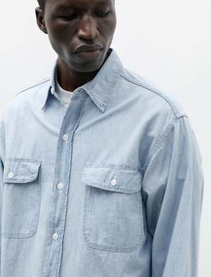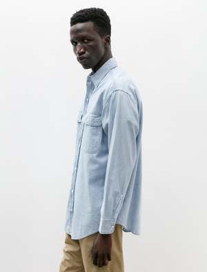 A relaxed, classic fit work shirt cut from a super lightweight cotton chambray shirting in a bleach-faded indigo blue. Features a classic collar, a strap style button placket, flap closure breast pockets with a pen holster at the left pocket, a rear faux yoke, and a gently curved hem. The classic utilitarian silhouette is at once incredibly comfortable and effortlessly wearable, evoking a sense of timeless functionality. Constructed with orSlows trademark durable finish using chain stitched, flat felled seams throughout; white melamine buttons.