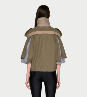 Stretch cotton-blend gabardine jacket in green and light brown. Raw edges throughout with a layered construction. Button tab at funnel neck and detachable pin-buckle strap at collar. Concealed button closure and detachable wraparound belt at chest. Welt pockets at waist and vented cuffs. Striped integrated poplin shirt-style underlay. Color: Green. Material: 58% polyester, 41% cotton, 1% elastane. Lining: 60% cotton, 40% polyester. Made in Greece. Type: Trenchcoat.