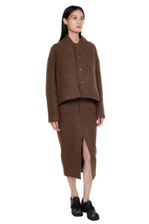 OUDE WAAG strikes a balance between Asian aesthetics and Western cutting. It is at the heart of designers philosophy: celebrating the power of women, yet simultaneously critiquing the ongoing objectification and idealisation of the body as you can see in the Oude Waag "Burn" collectsion with the Felt Midi Skirt Umber. This felt midi skirt is cut from Japanese wool-blend, that is soft, structured, and stretchy. The boxy silhouette of this skirt exudes effortless sophistication and elegance. The topstitching adds a refined touch while maintaining a clean, simple aesthetic. The distinctive front slit not only enhances style but also allows for ease of movement. Colour: Umber. Composition: 52% Polyester 48% Wool. Code: OW-24AW-SK11P1BR420