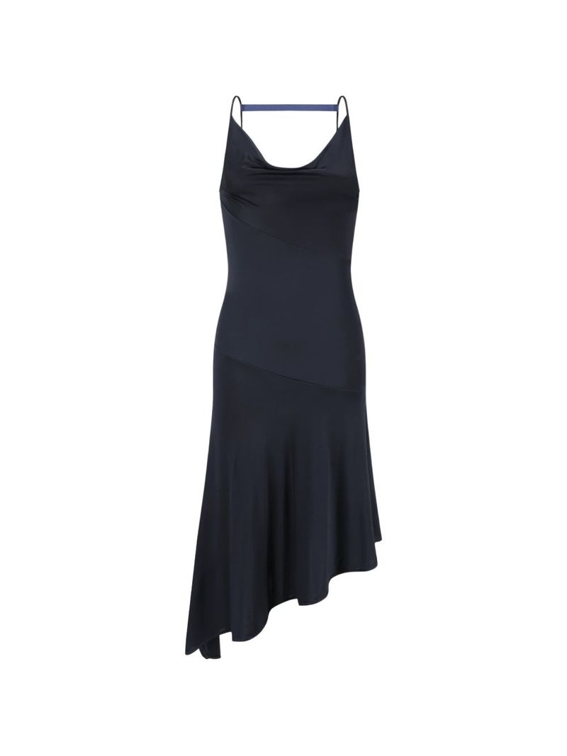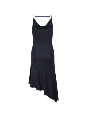 Ink blue dress with strap detail, cowl neck, thin straps, and an asymmetric hem. 77% Viscose 23% Silk Made in China.