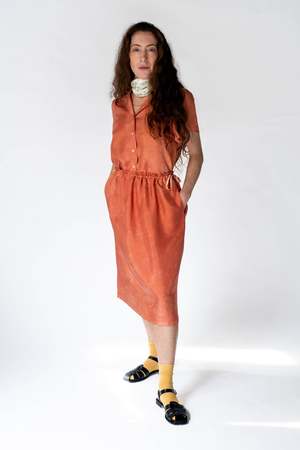 Dyed with handmade organic pigments obtained from loquat. The irregularity of the colour achieved with this artisanal process makes each garment unique and beautiful. This item is PH sensitive. Use a PH neutral soap and store out of direct sunlight. 100% silk twill, deadstock horn buttons.