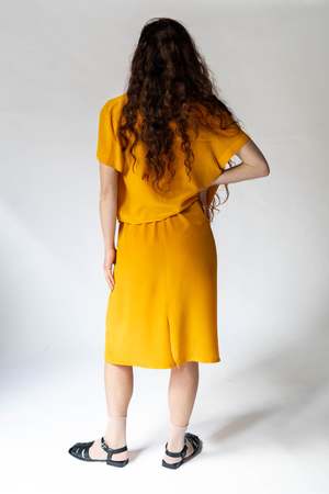 Dyed with handmade organic pigments obtained from onion. The irregularity of the colour achieved with this artisanal process makes each garment unique and beautiful. This item is PH sensitive. Use a PH neutral soap and store out of direct sunlight. 100% silk Twill, deadstock horn buttons.