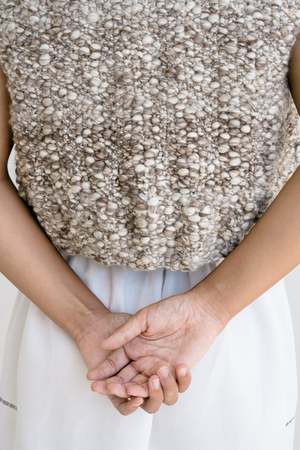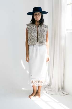 Sleeveless vest in undyed wool, crafted in a thick, irregular boucl knit. Boxy silhouette with wide armholes and an open front. Hand-knitted from the softest undyed, natural wooltransformed by a manipulation of tension during the spinning process to achieve a wonderfully spongy flam knit. Each piece is crafted by independent female artisans and finished with care in our studio. Our wool is renewable, breathable, and naturally elastic, softening and adapting to you over time. A timeless, zero-waste piece designed to last and connect you to the land, the animals, and the hands that made it. Each piece takes days to complete, carrying the warmth of tradition. 100% undyed Merino wool Made in Uruguay Agustina is 165cm / 5.4ft tall and is wearing size M.