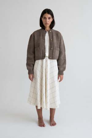 Handcrafted by female artisans in the rural areas of Uruguay with undyed wool obtained from extra-fine Merino and Corriedale sheep. Dead stock real horn buttons. Each button yields its own unique colour and configuration. Processed without chemicals and 3-ply twisted to minimize pilling. Some natural pilling may occur during use. Handle with care to preserve the original look. Limited edition. Can be hand knitted to order. 50% extra-fine Merino 50% Corriedale wool.
