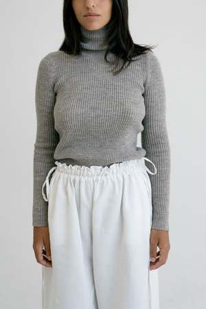 Ribbed wool sweater with turtleneck. Slim fit with long sleeves and straight hemline. Knitted from the softest undyed, natural wool, each piece is crafted by independent female artisans and finished with care in our studio. Our wool is renewable, breathable and naturally elastic, softening and adapting to you over time. A timeless, zero-waste piece designed to last and connect you to the land, the animals, and the hands that made it. Each piece takes days to complete, carrying the warmth of tradition. 100% extra-fine merino wool Made in Uruguay Agustina is 165cm / 5.4ft tall and is wearing size M