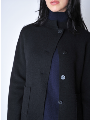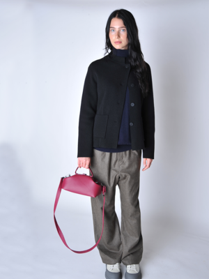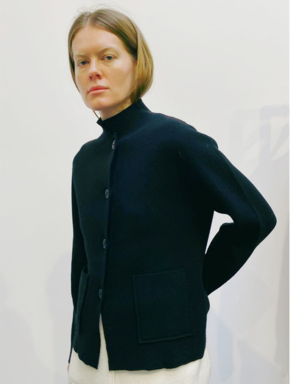 The Niaza Jacket is a chic knit jacket with a relaxed fit that is classic and elegant. Features architectural details on the neckline and hem, Nehru collar, button front, and patch pockets. Model is 5'8" and wearing size S. 100% cashmere Trademark Oyuna metal logo2 at the back Made in small quantities in Mongolia.