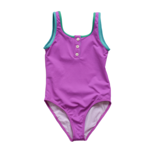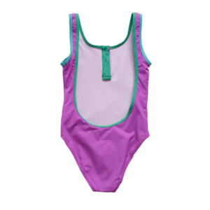 From Pacific Rainbow. Magenta one-piece girl's swimsuit with tank style straps, buttons at center front and low back. Color blocked detailing throughout. - From Pacific Rainbow Spring/Summer 2017 collectsion - Girl's one-piece swimsuit in Fuchsia - 43% PA 17% EA - Tank style straps - Slightly squared necklnie - Contrast piping at neckline, straps and back - 3 button placket at center front - Low rounded back - High cut leg