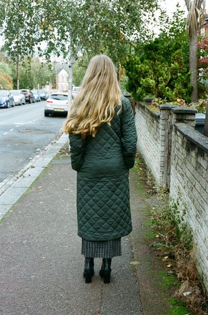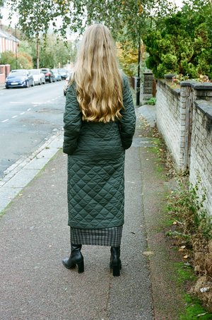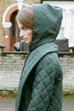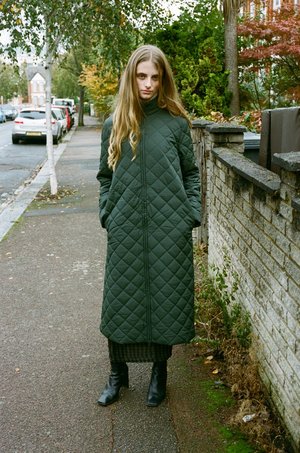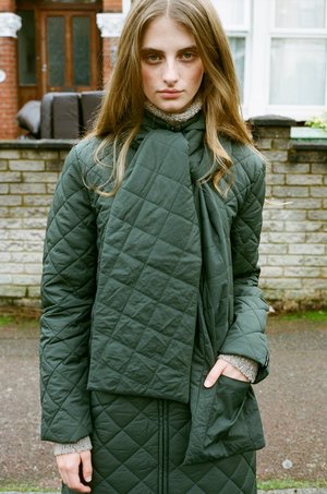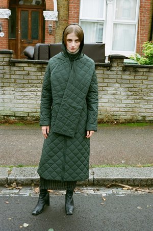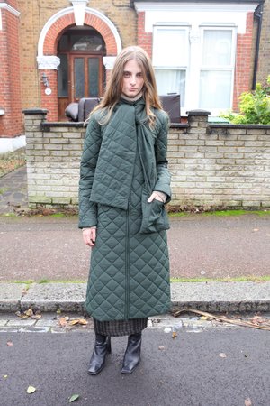 A long padded puffer coat with a removable hood / scarf. Side Pockets and zip front closure. PALOMA WOOL - Khaki - 100% Recycled Nylon, 100% Recycled Polyester - Made in China - Fits true to size - Lola is 5'7", size 8 UK and is wearing a size S. Worn with
