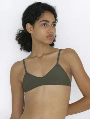 Adjustable minimalist bikini top. Perfect khaki green color. 79% Recycled Polyamide 21% Elastane. Made in Spain.
