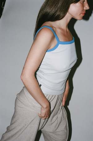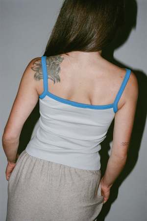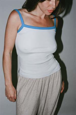 Paloma Wool Barkau Top in Light Grey - Strappy ribbed top with silicone 'Paloma Wool' label. - Fabric: 98% Organic Cotton 2% Elastane - Made in Portugal - Ariel is wearing size XS
