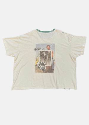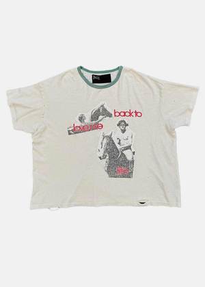 Cotton graphic t-shirt in white. Graphic print Ringer neck Short sleeves Distressed detail 100% Cotton Made in United States.