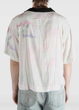 Rayon shirt in multicolor with a graphic print. Features a point collar, button fastening, chest pocket, and short sleeves. 100% rayon. Made in the United States.