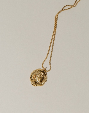 Pamela Card uses the ancient process of lost wax casting to sculpt and fracture The Birth of Venus Necklace. This piece was inspired by Botticellis iconic painting that depicts Venus, the goddess of love, beauty and fertility, arriving at the shore after her birth. The fractured design features the the face of Venus with her windblown hair swept lightly to the side. Handmade in Vancouver from 24K Gold Vermeil (which is 3 microns thick of 24K gold plated over sterling silver). Size + Fit: - Coin measures 2.4cm in length and 2.2cm in width. - 20 chain length.