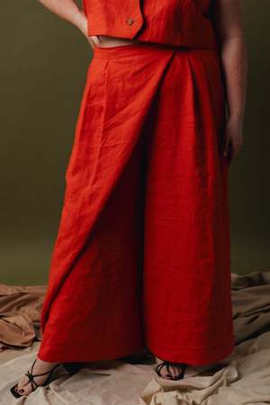 A modern pant that delivers on comfort, the Adrian is an adjustable wrap style. With two buttons at the closure allowing you to choose your waist fit, as well as an elasticated back waist, the Adrian is ideal for a fluctuating body. The tailored waist gives way to a roomy hip fit, thanks to front pleats. The Adrian features functional side pockets and textural coconut husk buttons. The standard inseam of this trouser is 1.5 longer than the Emil Easy. In linen, the Adrian Wrap Trouser has a beautiful and sophisticated drape. Its breathable yet substantial. Model: Briana is 55 and wears the size XS. Kendra is 510 and wears the size 2X/3X. Fabric: 100% laundered linen, midweight. Preshrunk. Garment Measurements: XS: Waistband 26, Hip 42, Rise 11.5, Inseam 25.25 2X/3X: Waistband 41, Hip 58, Rise 16.5, Inseam 26.5 S/M: Waistband 30, Hip 47, Rise 13.25, Inseam 25.25 4XL: Waistband 45, Hip 62, Rise 18, Inseam 26.5 L/XL: Waistband 35, Hip 50.5, Rise 14.25, Inseam 26.5 Please note that the waistband on this garment is elasticated to allow for some adjustability. Waist measurement is with elastic unstretched and the pant closed at the looser button.