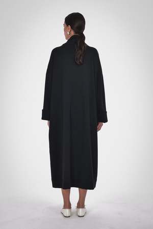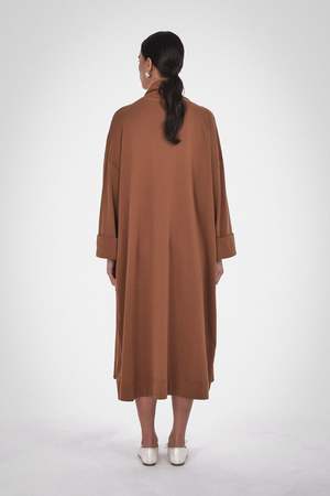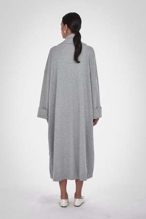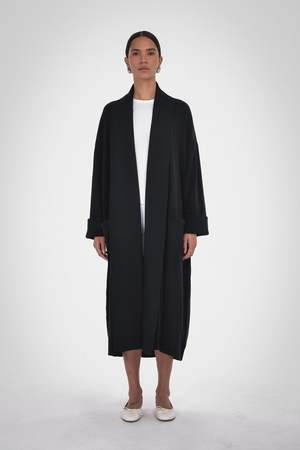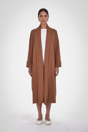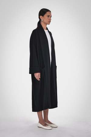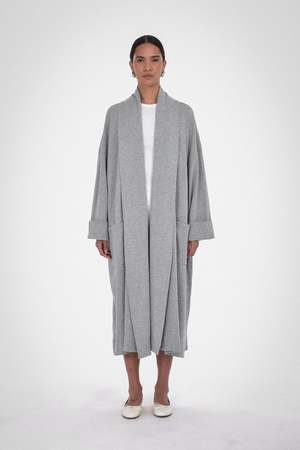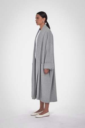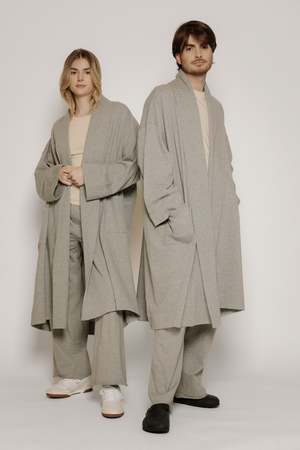 Final Sale. The ultimate lounge-at-home in luxury robe coat. This unisex robe is made from 100% Organic Cotton and is available in Caramel, Melange Grey, and Black. Details include a self-faced shawl collar in a long-line open-front fit. Wear it over pyjamas on relaxed mornings and evenings. Care: Machine wash cold with like colours, do not bleach, tumble dry low, cool iron if needed. Fabric: 100% Organic Cotton Fit: Oversized fit. Female model is wearing size 2 and male model is wearing size 3.