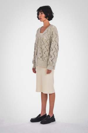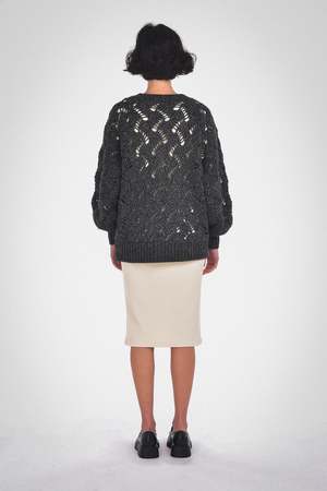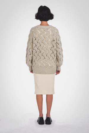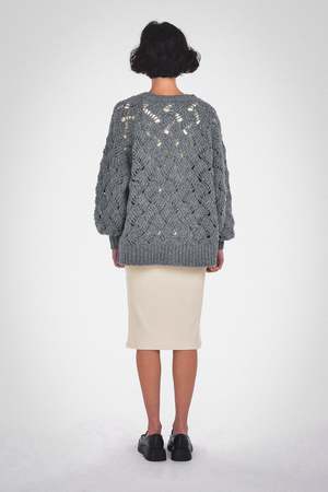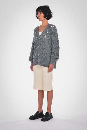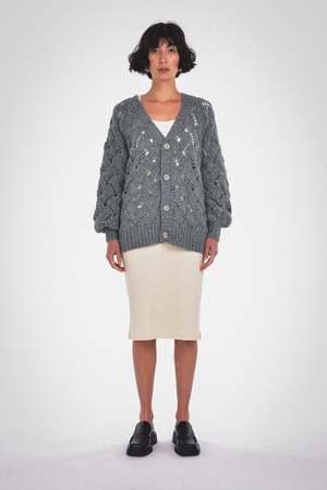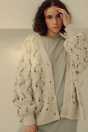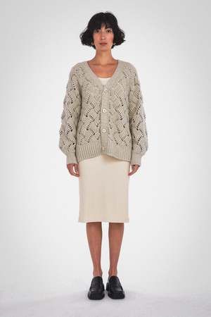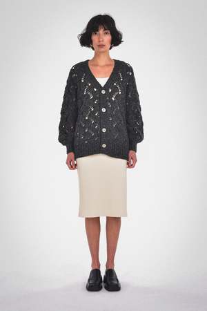This Lynn Cardigan can be a versatile and stylish addition to your fall and winter outfits. Its balloon sleeves add a slightly dramatic element to the cardigan's design, while the center front buttons provide options for how you wear it. The garment boasts a plunging V-neckline and ribbed detailing, all in a relaxed fit. Care: Dry clean only. Fabric: 68% RWS Merino Wool / 28% Recycled Nylon / 4% Alpaca / GRS Certified / RWS Certified / WRAP Certified Fit: Model wears a small. Oversized fit. XS: Body Length: 23 3/4" Chest (Circumference): 44" S: Body Length: 24 1/4" Chest (Circumference): 46" M: Body Length: 24 3/4" Chest (Circumference): 48" L: Body Length: 25 1/4" Chest (Circumference): 50" XL: Body Length: 25 3/4" Chest (Circumference): 52"
