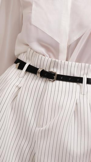 These white shorts feature elegant black stripes. Dry Clean Only.
