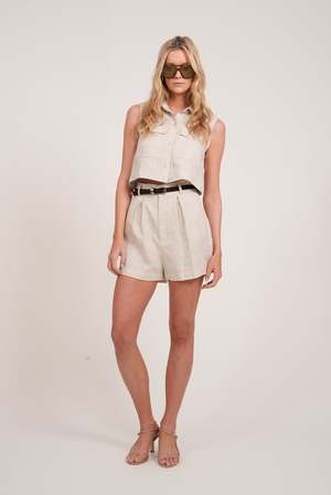 Introducing the Vale top, the perfect blend of style and comfort. Made of high-quality linen, this crop top features a sleeveless design and a classic button-down front. Complete your summer wardrobe with this versatile piece that offers both elegance and breathability. Style it with our Esme Shorts or Monica Pants. 100% Linen Dry Clean Only Model wears size small.