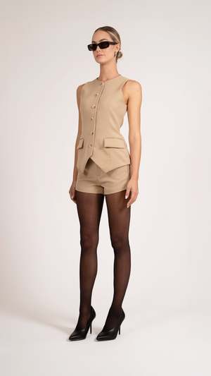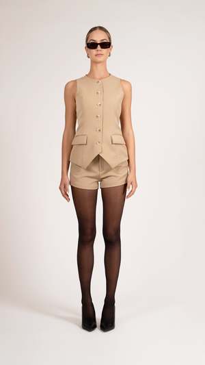 Introducing Liv Vest, the perfect addition to your wardrobe. Featuring a front button closure and flap pockets for a sophisticated touch. Made with premium suiting fabric and an adjustable back tab for a perfect fit. Elevate your style with this ultimate vest. Model is wearing Size Small Dry Clean