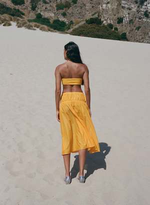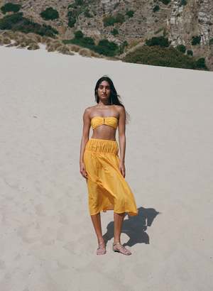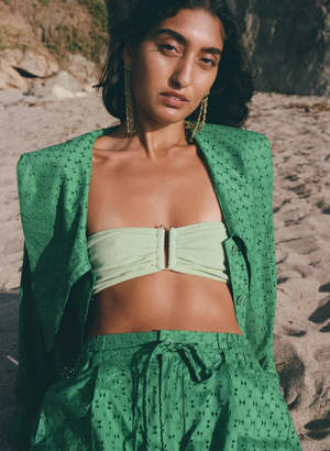 Two-piece swimsuit with bandeau top and high-waist brief. The bandeau features gold tone hardware with ruched detail at the front. Soft construction without uncomfortable wires and a secure fit in soft four-way stretch textured micro-terry knit. Self-lined. Made of regenerated ECONYL fabric finely re-spun from reclaimed ghost fishing nets, discarded carpets, and pre-consumer waste. Fabric offers UV protection and is chlorine resistant. 85% Recycled Polyamide / 15% Elastane Made in Los Angeles.