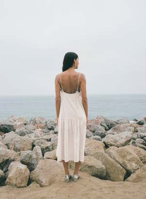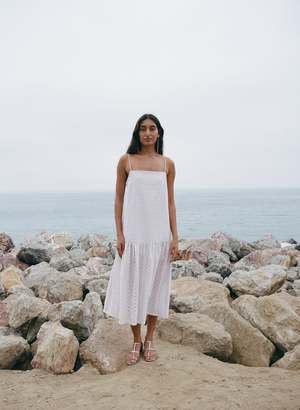 Easy fit drop waist dress in open-work geometric cotton eyelet. Fine straps tie at base of back. Gathered skirt. Lined in cotton voile for coverage. 100% Cotton. Made in Los Angeles.