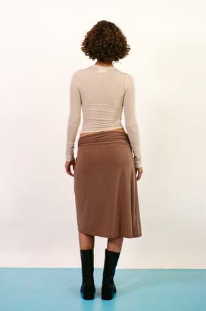 Slip on style stretch jersey skirt hitting just above the knee in length. The Ida Skirt has a classic Paris Georgia signature one sided twist detail at the hip, designed to slouch off the waist with plenty of stretch, and an effortless drape toward the bottom hem to follow. Featured in mocha brown. Measurements (laying flat and indicates stretch): Size Medium: Waist 32-40, Open hip, Length 28 Size Large: Waist 33-42, Open hip, Length 28.5 Kenzie is 5'9 and a size small/medium, and wears size medium with the Sheer Long Sleeve in Cream, Belmont Boot in Black, and Two Tone Diario Necklace. Material: 95% polyester, 5% spandex. Cold gentle machine or hand wash, or dry clean. Dry flat in shade. Do not tumble dry. Made in China.
