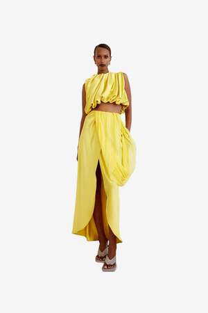 The Viola Skirt by PARIS GEORGIA features a vibrant sunflower yellow colorway. Crafted from 100% silk with a contrast of 63% triacetate and 37% polyester.