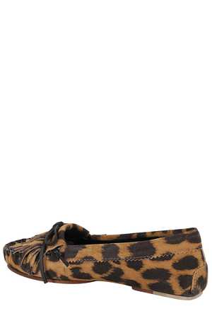 Women > Shoes > Flat Shoes Indiana loafer by Paris Texas in rust color with a leopard print suede upper. Features front fringe and bow appliqus and a leather sole.