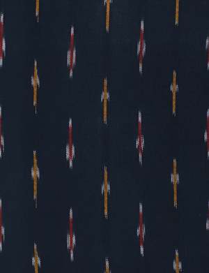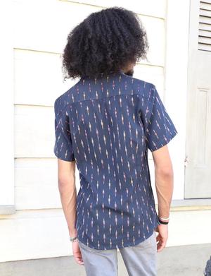 This short-sleeve button-down shirt is crafted from 100% woven cotton and features a handwoven ikat pattern in navy, red, orange, and white. The silhouette offers a slim fit with a straight, narrow profile that tapers gently at the waist, balanced by a broader fit across the shoulders. This construction provides a defined shape without stretch. The shirt is suitable for a range of occasions, from professional settings to casual social gatherings. FEATURE BULLETS: 100% woven cotton fabric ensures breathability and comfort. Handwoven ikat textile provides a unique, artisanal pattern. Slim fit with a straight, narrow profile and broader shoulders for a structured silhouette. Handmade in India, with potential for minor shade variations.