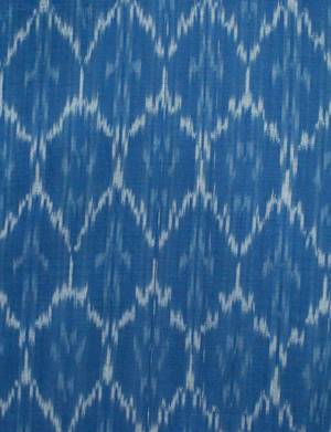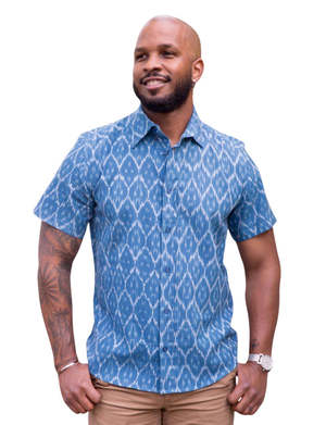 A short-sleeve button-down shirt featuring a cobalt blue ikat print. The shirt is constructed from 100% handwoven and hand-dyed cotton in India. It offers a tailored fit with a gentle taper at the waist and a straighter, narrower profile compared to a broader shoulder fit. This garment is handmade, which may result in minor shade variations from the product image. FEATURE BULLETS: Made from 100% handwoven and hand-dyed cotton for breathability. Features a tailored slim fit with a straight, narrow profile. Handmade in India, supporting fair trade practices.