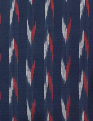 This button-down shirt is constructed from 100% organic woven cotton in a handwoven ikat fabric. The shirt features a deep navy base with a repeating pattern of red and white ikat motifs. Its construction includes a gentle taper at the waist, providing a refined silhouette. The fit is relaxed through the shoulders and sleeves, offering comfort for extended wear. FEATURE BULLETS: Crafted from 100% organic woven cotton for a soft, breathable feel. Features a unique, handwoven ikat fabric with a navy, red, and white pattern. Relaxed shoulder and sleeve fit for comfortable, all-day wear. Designed with a subtle waist taper for a flattering silhouette. Handmade in India.