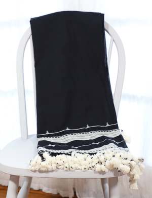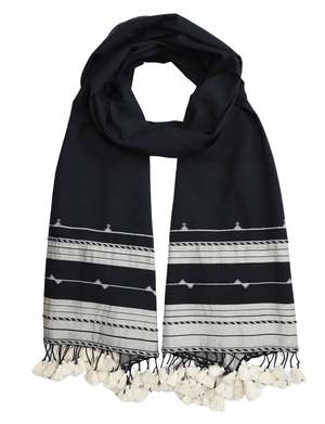 The Kutch Scarf is a handwoven accessory crafted from 100% cotton. Artisans in the Kutch region of India employ traditional weaving techniques to create this lightweight scarf, featuring a classic black base with subtle white motifs. The hand-dyed fabric and fair trade production highlight the craftsmanship and heritage of its origin. Its generous size allows for versatile styling, suitable for everyday wear. Due to the handmade nature of the scarf, slight variations in shade may occur. FEATURE BULLETS: Measures 22" wide by 75" long for versatile styling options. Constructed from 100% cotton for a soft, breathable feel. Features traditional handwoven patterns and hand-dyed fabric. Ethically produced through fair trade practices in India.