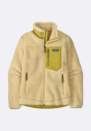 The Women's Classic Retro-X Jacket by Patagonia is crafted from 12.9-oz 100% polyester (50% recycled) bonded sherpa fleece with a 3.2-oz 100% polyester (50% recycled) warp-knit mesh lining. Features include a windproof membrane bonded between 1/4"-pile sherpa fleece exterior, moisture-wicking and highly air-permeable warp-knit mesh, a full zipper with internal wind flap, Y-joint sleeves for better mobility through the shoulders and arms, a vertical zippered chest pocket, and zippered handwarmers lined with brushed-polyester mesh. The jacket has a hip-length design.