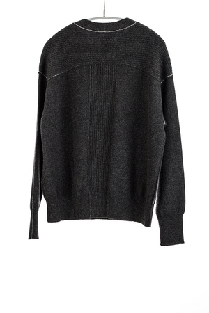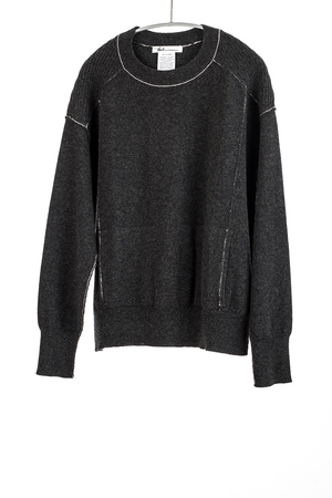 Relaxed fitting cozy pullover featuring crew neck, hidden pockets, and exposed seaming details in contrasting color. Shoulder and center back panels are knitted with 2 ends of 2-ply cashmere in 7 gauge, for substantial texture and a chunky look without making the sweater too heavy to wear everyday. 12 gauge mixed with 7 gauge. Hand wash in cool water recommended. Dry cleanable.