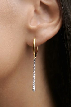 Dainty oval hoop earrings with a long zirconia drop pendant. - Oval hoop earrings. - Material: Sterling silver (100% recycled silver). - Finishing: 18K gold plating. - Stones: White cubic zirconia. - Color: Gold. - Length: 50 mm. - Motif measurements: 30 mm. - Weight: 4.01 g. - Each purchase includes a cotton jewelry pouch, placed inside the branded jewelry box and bag. - Care: Avoid contact with water, sweat, sunscreen, or any liquid spray. If the jewelry comes into contact with any kind of liquid, wipe it down immediately and leave it to dry in the shade. Clean with a soft cloth if needed. When not in use, store your jewelry in a dry area in its protective velvet bag or box to keep it away from dust or humidity. - Reinvention jewelry basics: These jewelry essentials embody everyday versatilitytimeless staples perfect for daily wear or stacking for special occasions. Crafted in 18K gold-plated silver or brass and adorned with sparkling cubic zirconia to match any style. - Recycled silver: As part of PDPAOLA's commitment to responsible materials, recycled silver is used in the manufacturing of many pieces, sourced from verified organizations.