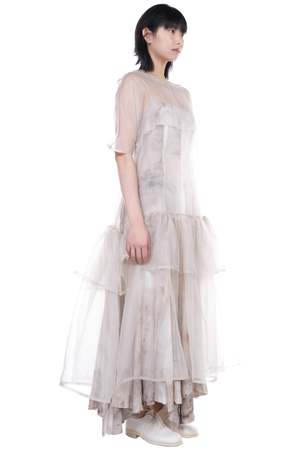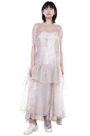 See-through Silk Dress in Grey from Peng Tai. Long Sleeves. Wide round neck. Brand stitching at back. Beautiful organza fabric. Puff pleats dress details. Peng Tai Season X "The earth nourishes everything. Everything in the world comes from the earth and returns to the earth. Therefore, the earth can nourish everything, and it is both the source and the place of return. The word "earth" also represents home and the countryside. Colour: Grey. Composition: 100% Organza