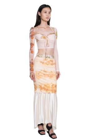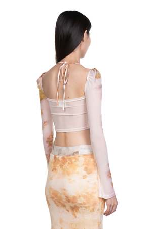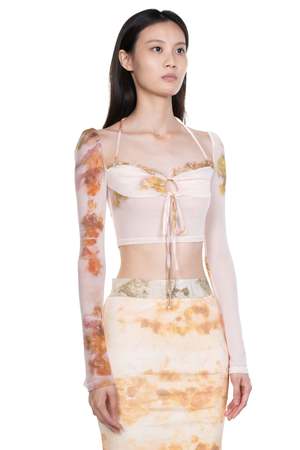 Peng Tai creates modern silhouette with traditional chinese philosophy. Inspired by how Chinese herbal medicine regulates the body from the inside out, Peng Tai aims to research and develop a way to boil Chinese herbal medicine with fabrics, to create clothes that feel like a second skin as seen with the Chinese Medicine Print Lace-Up Top. Printed lace top. Cropped. Signature print throughout. Long sleeves. Straps at shoulders. Colour: Random. Composition: Poly.