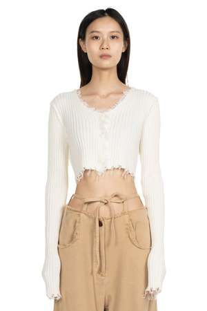Peng Tai creates modern silhouette with traditional chinese philosophy. Inspired by how Chinese herbal medicine regulates the body from the inside out, Peng Tai aims to research and develop a way to boil Chinese herbal medicine with fabrics, to create clothes that feel like a second skin as seen with the Cropped Knit Shirt Off White. Peng Tai Cropped knit shirt. Long sleeves. Cropped. Distressed details cuffs, bottom and collar. Button closure at front. Soft textural fabric. Colour: Off White. Composition: Poly Mix