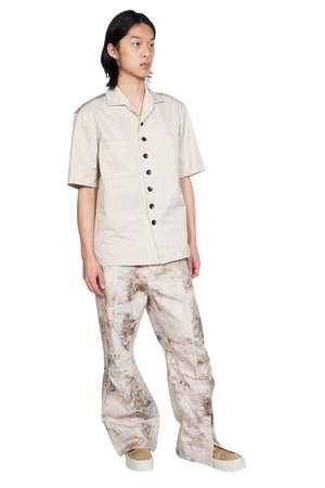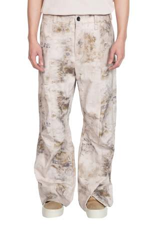 Peng Tai creates modern silhouette with traditional chinese philosophy. Inspired by how Chinese herbal medicine regulates the body from the inside out, Peng Tai aims to research and develop a way to boil Chinese herbal medicine with fabrics, to create clothes that feel like a second skin as seen with the Dyed Denim Alien Trousers. Button closure at waist. Two side pocket at waist. Two back pockets. Slit at front. Medicinal dye throughout. Colour: Random colour. Composition: Cotton.
